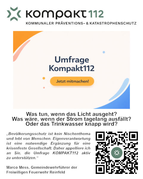 KOMPAKT112 „Kommunaler Präventions- & Katastrophenschutz“ geht diesen Fragen wissenschaftlich nach. Die Universität zu Lübeck führt in Partnerschaft mit der Stadt Reinfeld und dem Amt Nordstormarn eine umfassende Erhebung durch, die sowohl die Perspektive der Bevölkerung als auch die Sicht von Fachkräften aus BOS-Organisationen und Kommunalverwaltung einbezieht. Danach helfen die Ergebnisse Ansatzpunkte für die Maßnahmen zu liefern.
