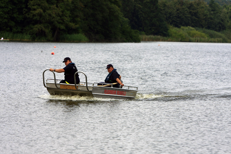 Zwei Kameraden stellten mit dem Mehrzweck-Boot der Feuerwehr die Regattabegleitung.