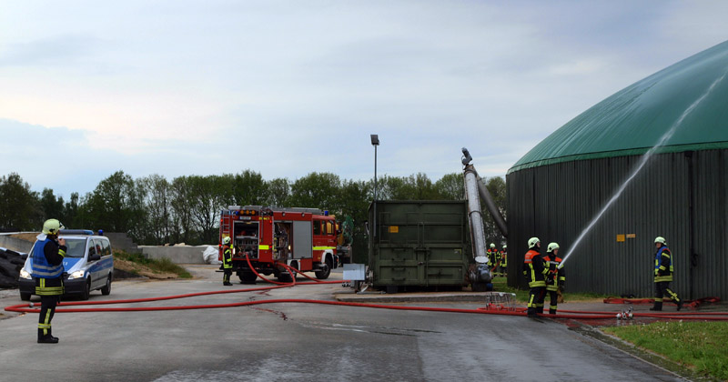 Gemeinsam mit den drei Ortsfeuerwehren der Gemeinde Wesenberg (FF Groß Wesenberg, FF Ratzbek und FF Stubbendorf) wurde auf dem Gelände der Biogasanlage an der Bundesstraße 75 geübt.