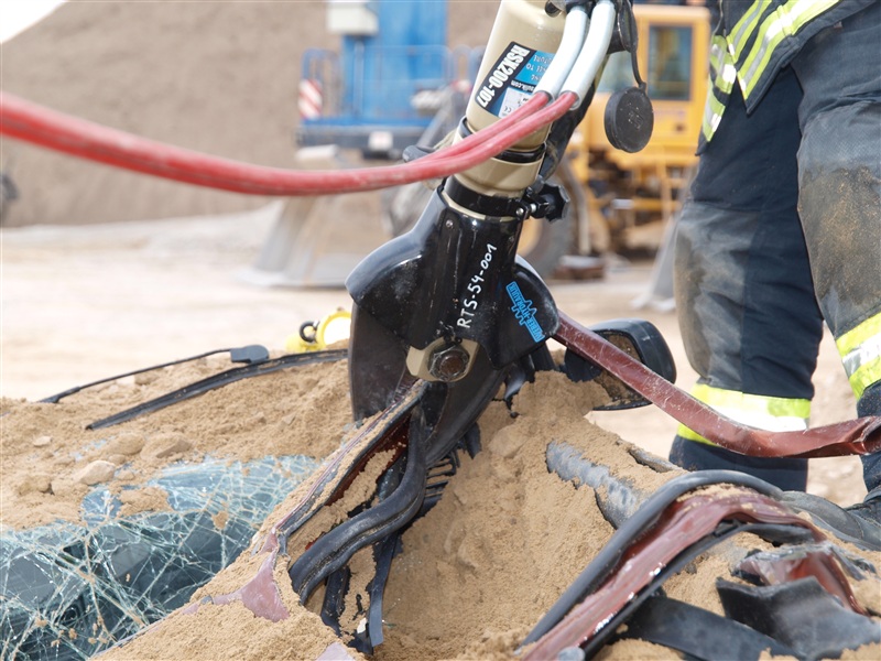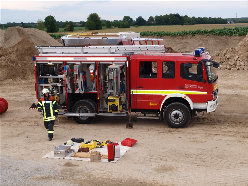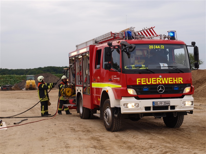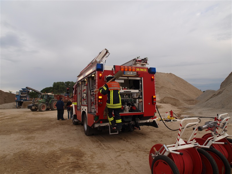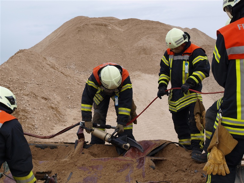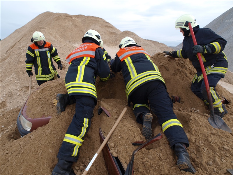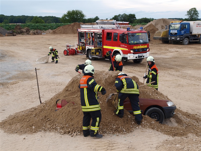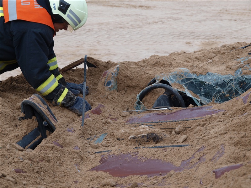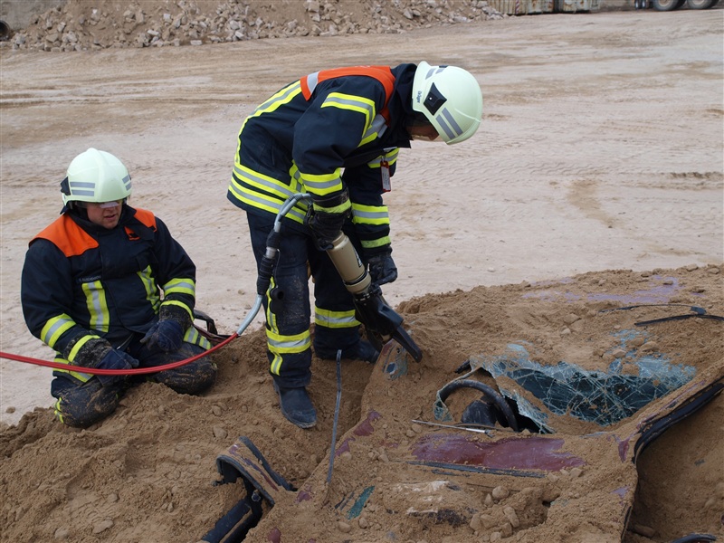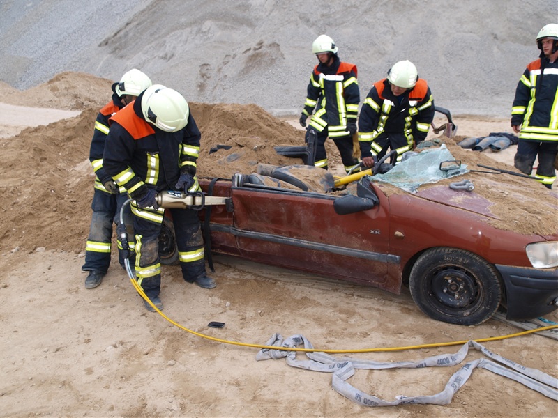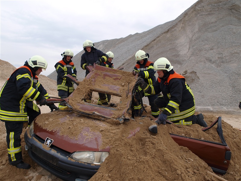 Nach Eintreffen der Feuerwehr wurde die Lage erkundet und der Gruppenführer teilte seine Leute ein. Während das Auto mit Schaufeln, Spaten und bloßen Händen Stück für Stück freigelegt wurde, bereitete der Maschinist die Gerätschaften für die technische Rettung vor. Anschließend wurde das völlig eingedrückte Dach mit der Rettungsschere entfernt, um so einen Zugang zum Verletzten herstellen zu können. Mit Hilfe des Löschfahrzeugs wurde dann das Fahrzeug aus dem Sandhaufen gezogen und die Tür mit dem Spreizer geöffnet. Da die verletzte Person im Fußraum eingeklemmt war, musste mit einem Rettungszylinder der Vorderwagen weggedrückt werden. Jetzt konnte die Person aus ihrer misslichen Lage gerettet werden.