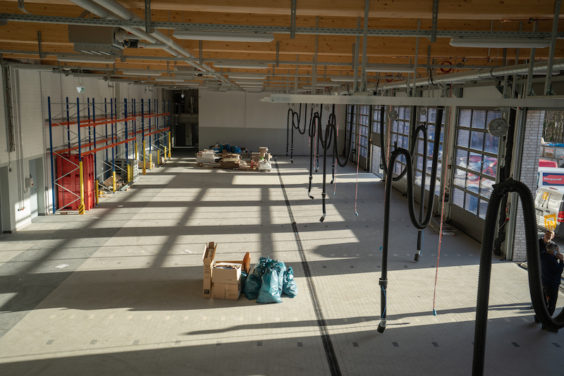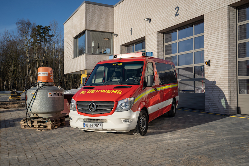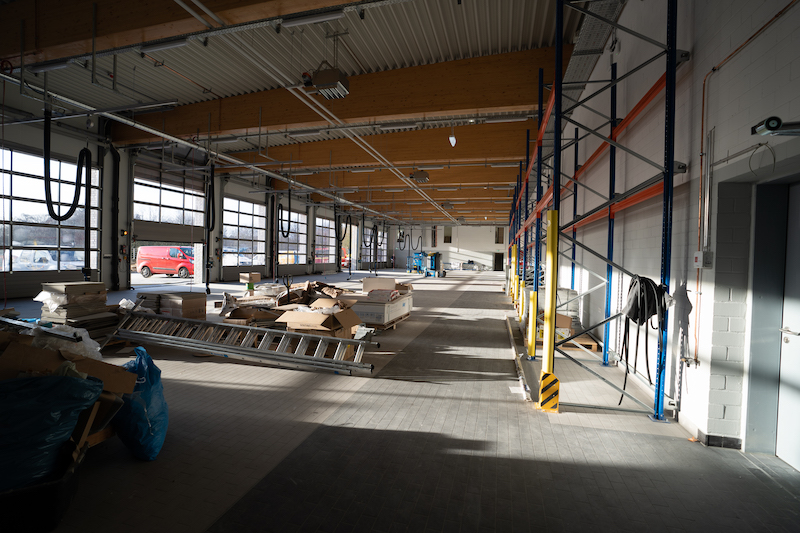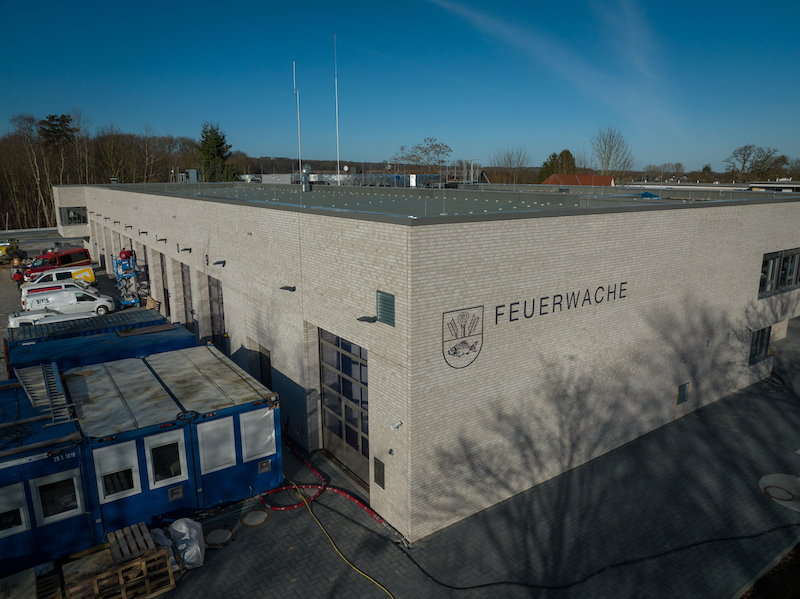 Seit unserem 2. Tagebucheintrag ist für alle weithin erkennbar sehr viel passiert. In den letzten Monaten waren viele Beteiligte auf allen Seiten immens bemüht, den Baufortschritt weiter voranzutreiben. Neben der Installation der erforderlichen Gebäudetechnik wie Heizung, Photovoltaik-Anlage und Sanitärinstallation wurde inzwischen auch die Absauganlage in der Fahrzeughalle sowie die Hallentore eingebaut. Rund ums Gebäude sind die Pflasterarbeiten derzeit in vollem Gange und werden in naher Zukunft abgeschlossen sein.