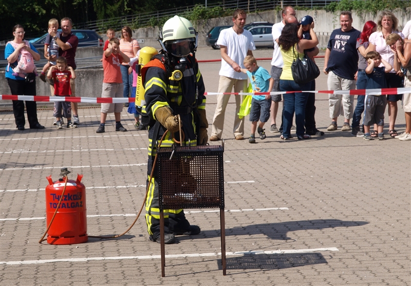 Bei verschiedenen Vorführungen, vom PKW-Brand bis zum Gefahrguteinsatz, konnten wir den Besuchern zeigen, wie die Feuerwehr arbeitet und welch moderne Technik uns dabei zur Verfügung steht. Zudem bestand im Nachhinein die Möglichkeit, näher an das Geschehen heranzutreten und Gerätschaften auch mal in die eigenen Hände zu nehmen. Für die "kleinen" Besucher boten wir ein Wasserspiel, eine Hüpfburg und Dosenwerfen an, was sehr gut angenommen wurde. Auch für das leibliche Wohl wurde gesorgt; in Form von reichlich Kuchen, Pommes und Leckereien vom Grill.