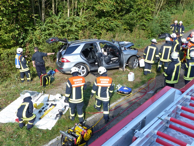 | Der Fahrer eines PKW kam mit seinem Fahrzeug nach links von der Fahrbahn ab und wurde eingeklemmt. Die FF Reinfeld unterstützte die FF Barnitz bei der patientengerechten Rettung des Fahrers. |