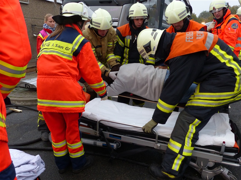 Bereits zum zweiten Mal nahmen wir mit einer Gruppe an den Bargteheider Rettungstagen teil. Wie zuletzt vor zwei Jahren wurde auch dieses Mal eine Großschadenslage simuliert, bei der mehrere PKW, Baumaschinen und ein Linienbus verunglückt sind. Die Feuerwehr Reinfeld wurde im Abschnitt 1 eingesetzt. Hier wurde unter anderem ein PKW zwischen zwei LKW eingeklemmt. Zudem ist ein PKW in einen Wohnwagen gerast, in dem sich noch Personen befanden. Ziel dieser Übung war es nicht, die Verletzen schnellstmöglich aus ihrer misslichen Lage zu befreien. Vielmehr ging es darum, dass jeder einmal mit den diversen Gerätschaften arbeiten konnte, um so im Ernstfall richtig handeln zu können.