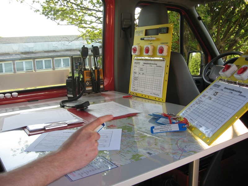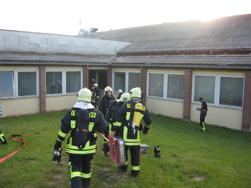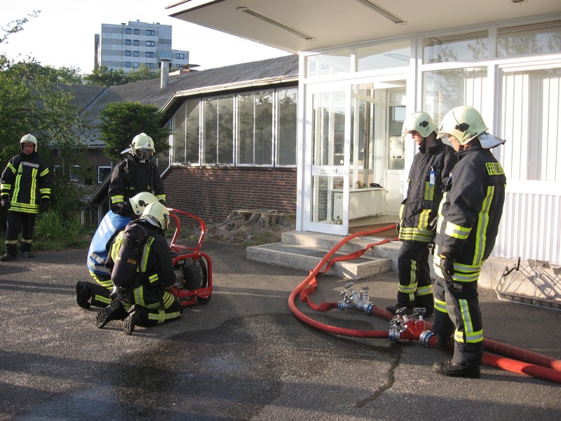 Schnell wurden die Fahrzeuge besetzt und es wurde zum Einsatzort ausgerückt. Hier schrillte dann tatsächlich die Brandmeldeanlage, sie zeigte ein Feuer im Bürotrakt an.