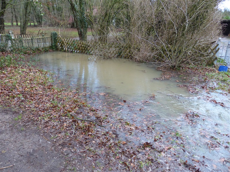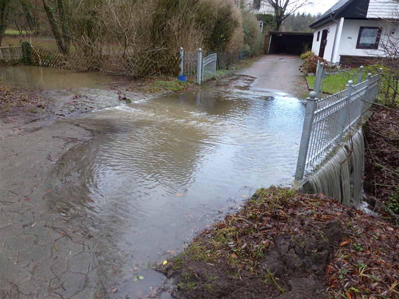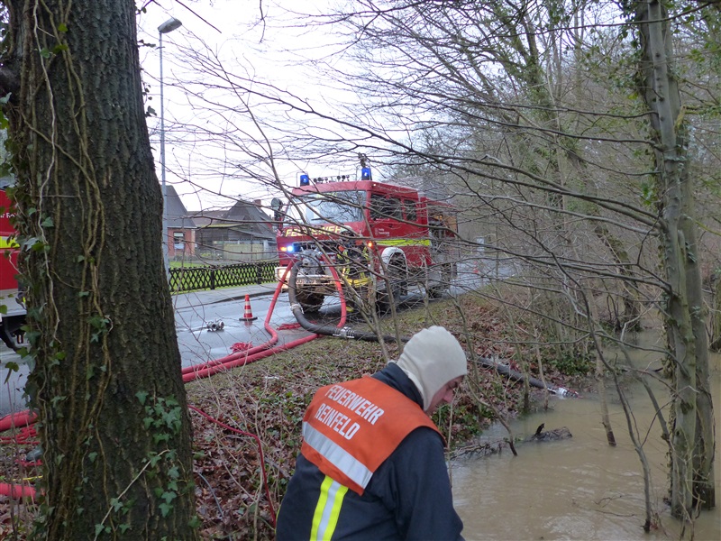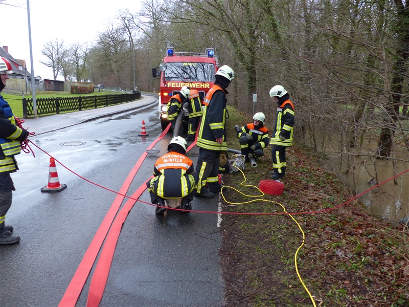 | Durch die starken Regenfälle kam es zu einer Überflutung von zwei Grundstücken, das Wasser drohte in die Keller zu laufen. Grund war ein verstopftes Rohr in einem Graben. Es wurde versucht, das Rohr von Ästen usw. zu befreien, dies gelang aufgrund des hohen Wasserdrucks nicht. Um ein weiteres Ansteigen zu verhindern wurde um das Rohr herum gepumpt, zeitweise mehr als 3000 Liter pro Minute. Mit einem vom Gewässerpflegeverband angeforderten Bagger wurde dann das Rohr frei gemacht, das Wasser konnte selbstständig weiter ablaufen. |