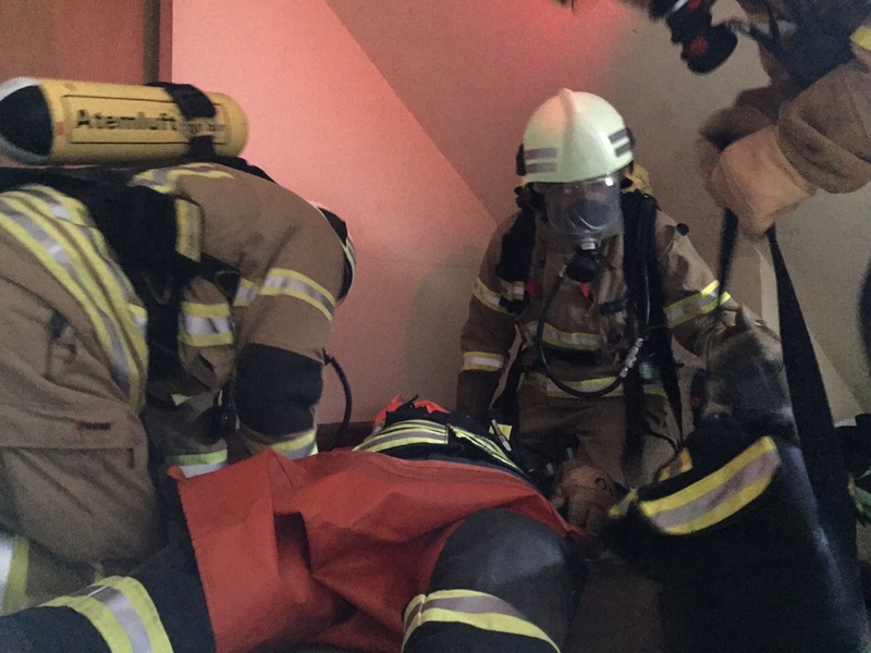 Entlang der Schlauchleitung des verunfallten Trupps bahnte sich der Rettungstrupp den Weg durch den Raum - alles ohne auch nur einen Zentimeter sehen zu können, um die Atemschutzgeräteträger neben der körperlichen Belastung auch psychisch unter Druck zu setzen.