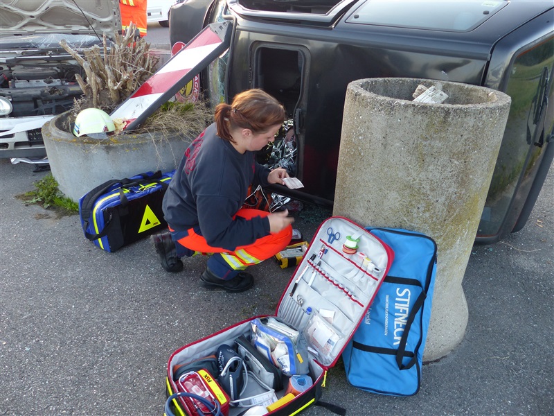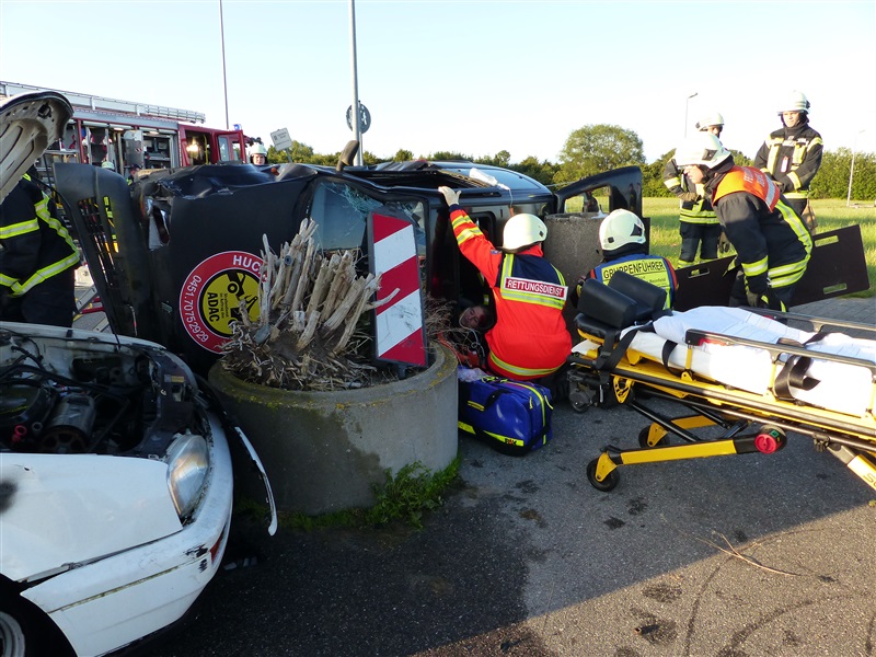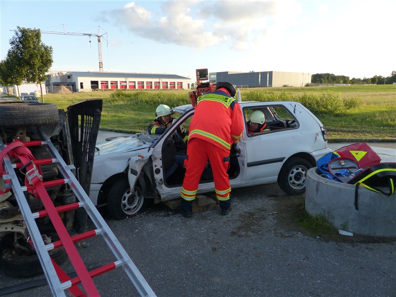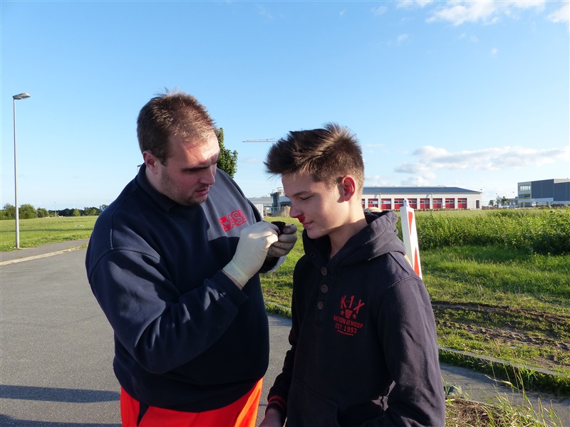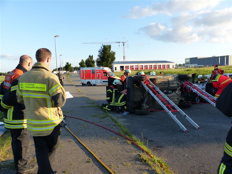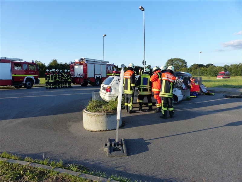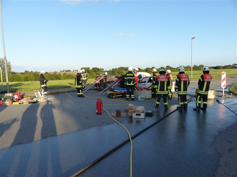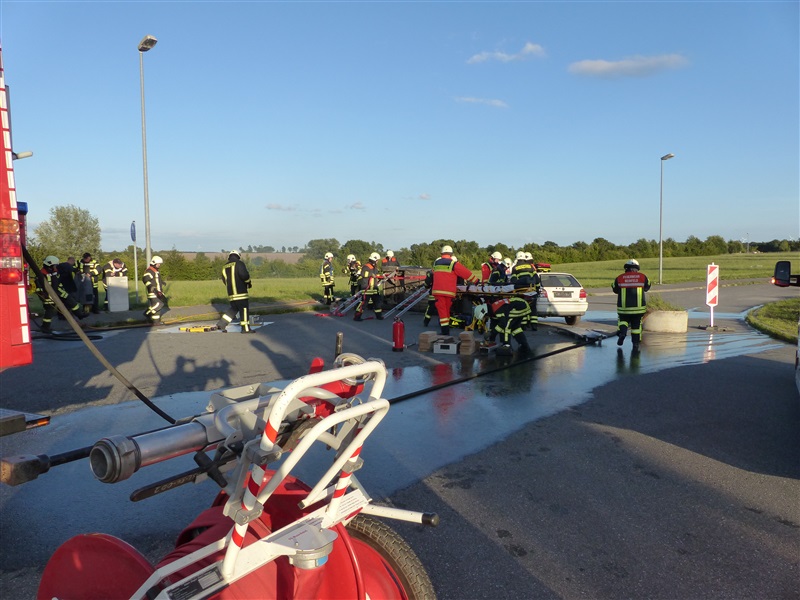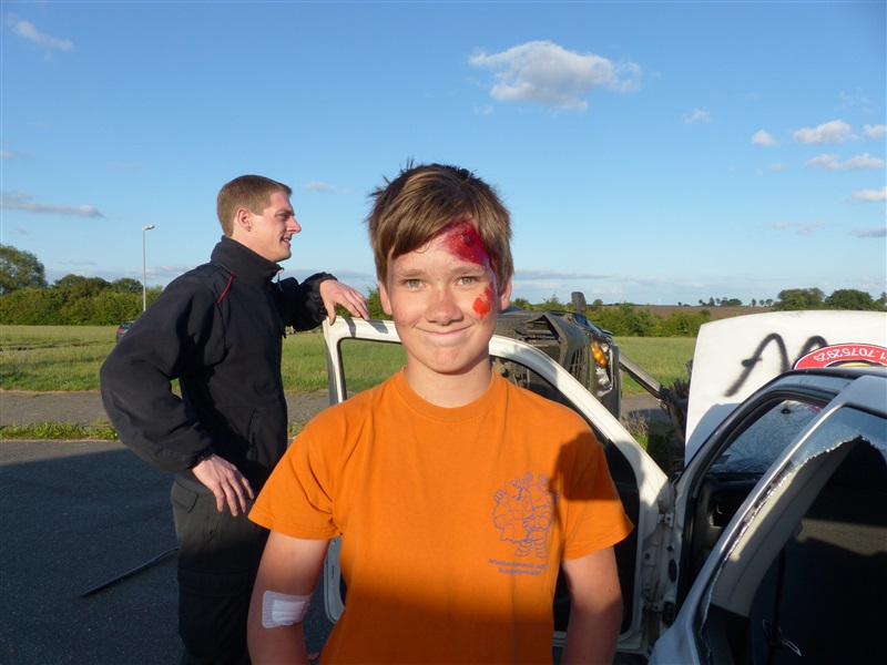 Gemeinsam mit dem ASB trainierten wir die Vorgehensweise bei einem Verkehrsunfall mit zwei beteiligten Fahrzeugen, von denen sich eins in Seitenlage befand und eine Rauchentwicklung zu erkennen war. Mitglieder der "Realistischen Unfalldarstellung" des ASB schminkten hierfür drei Verletztendarsteller, um eine realitätsnahe Übungsstelle zu simulieren. Die Besatzungen der beiden ersteingetroffenen RTW übernahmen die medizinische Versorgung der Verletzten. Kurze Zeit später trafen die Kameraden der Feuerwehr Reinfeld an der Unfallstelle ein und kümmerten sich um die Brandbekämpfung und die technische Rettung der Verletzten, von denen zwei in ihren Fahrzeugen eingeklemmt sein sollten. Nach dem Übungsende wurde der Ablauf reflektiert und die Kameraden vom ASB gaben uns wertvolle Tipps, was beim Umgang mit Verletzen beachtet werden muss.