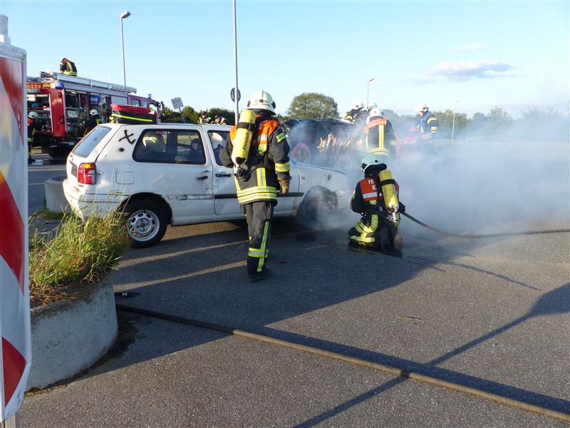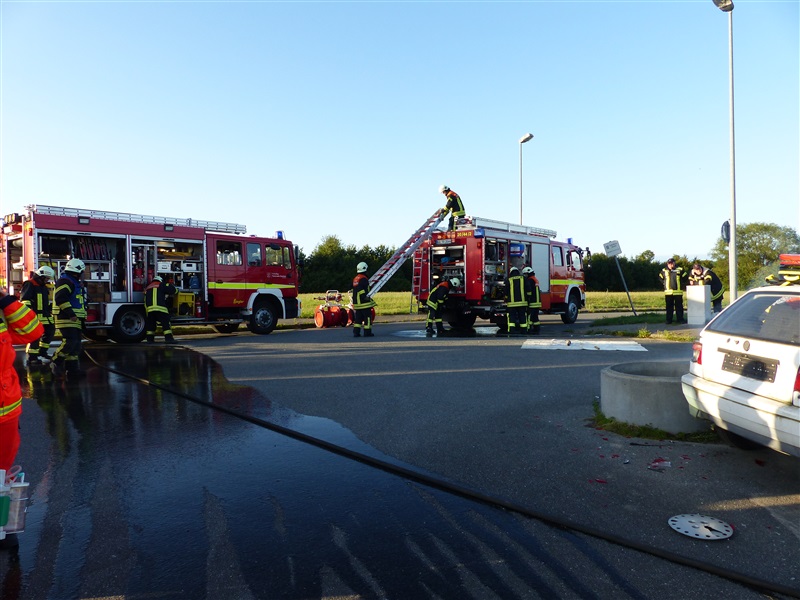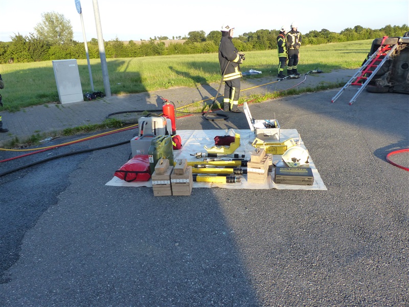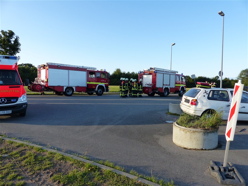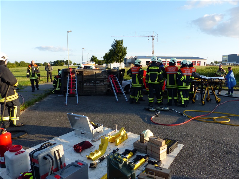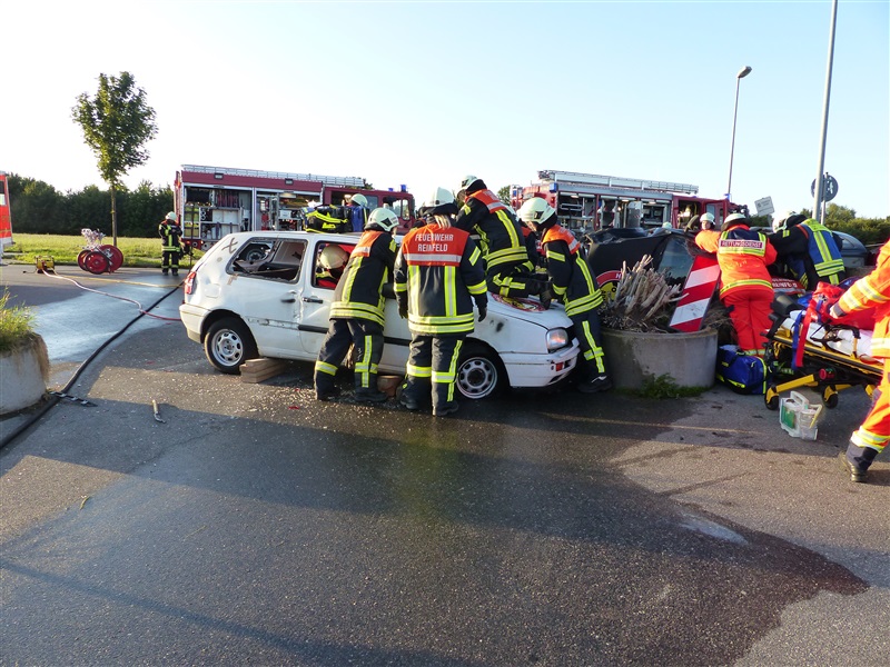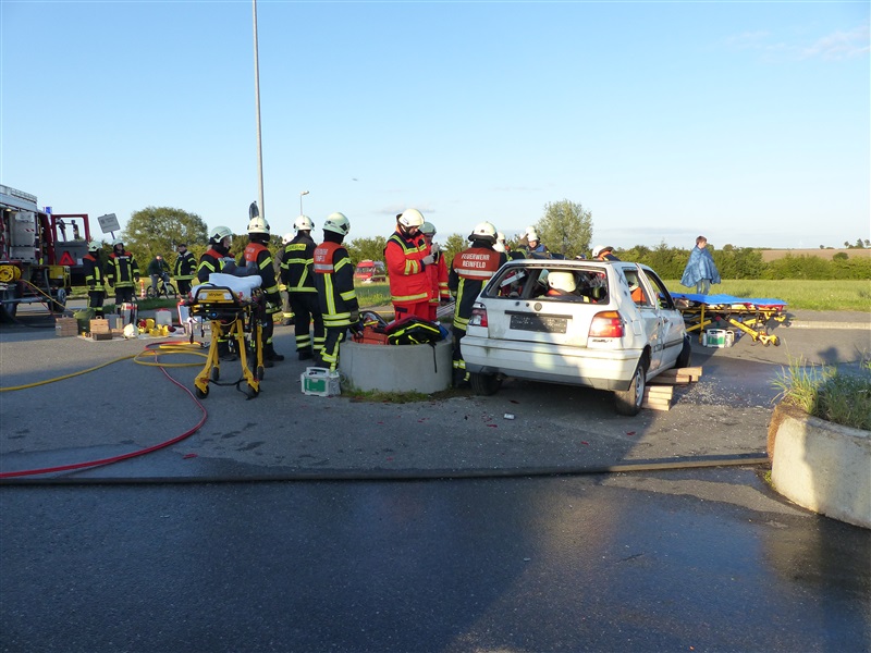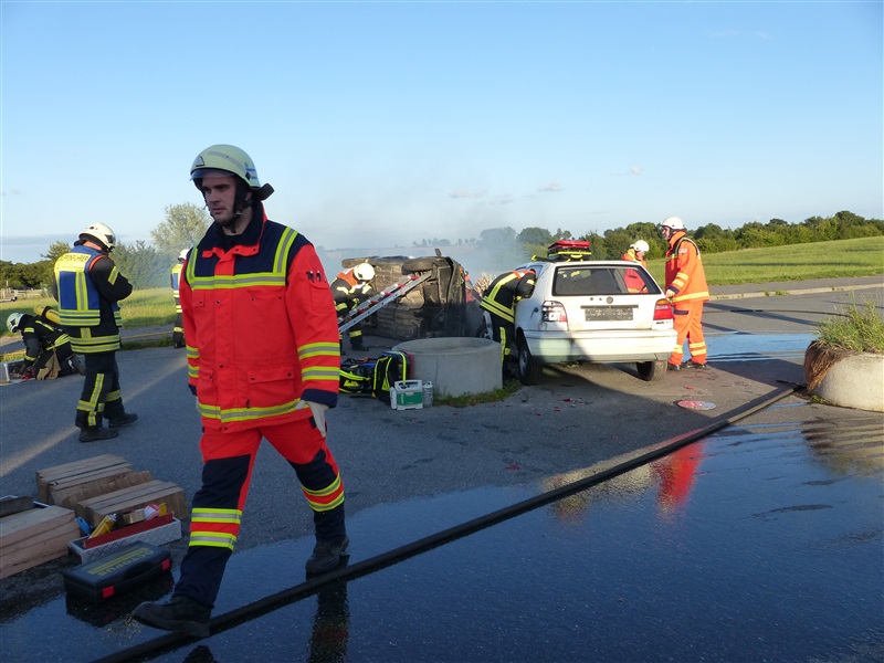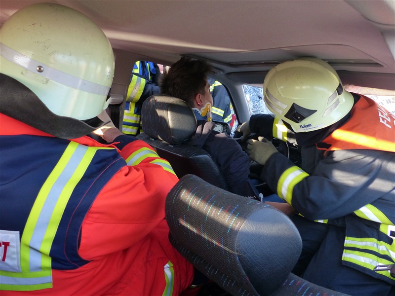 Gemeinsam mit dem ASB trainierten wir die Vorgehensweise bei einem Verkehrsunfall mit zwei beteiligten Fahrzeugen, von denen sich eins in Seitenlage befand und eine Rauchentwicklung zu erkennen war. Mitglieder der "Realistischen Unfalldarstellung" des ASB schminkten hierfür drei Verletztendarsteller, um eine realitätsnahe Übungsstelle zu simulieren. Die Besatzungen der beiden ersteingetroffenen RTW übernahmen die medizinische Versorgung der Verletzten. Kurze Zeit später trafen die Kameraden der Feuerwehr Reinfeld an der Unfallstelle ein und kümmerten sich um die Brandbekämpfung und die technische Rettung der Verletzten, von denen zwei in ihren Fahrzeugen eingeklemmt sein sollten. Nach dem Übungsende wurde der Ablauf reflektiert und die Kameraden vom ASB gaben uns wertvolle Tipps, was beim Umgang mit Verletzen beachtet werden muss.