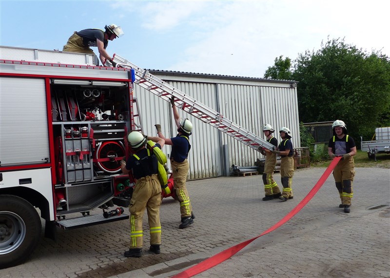 Im Anschluss beschäftigten wir uns mit der Atemschutzüberwachung, der Atemschutznotfalltasche und verschiedener Möglichkeiten eines effizienten Schlauchmanagements. In zwei kurzen Fallbeispielen wurden anschließend die ersten Minuten eines Brandeinsatzes trainiert. Im Fokus standen hier die verschiedenen Aufgaben der einzelnen Trupps des Löschfahrzeugs, sowie die richtige Beurteilung der vorhandenen Lage. Ein gemeinsames Abendbrot unter freien Himmel bildete den Abschluss der Ausbildungseinheit.