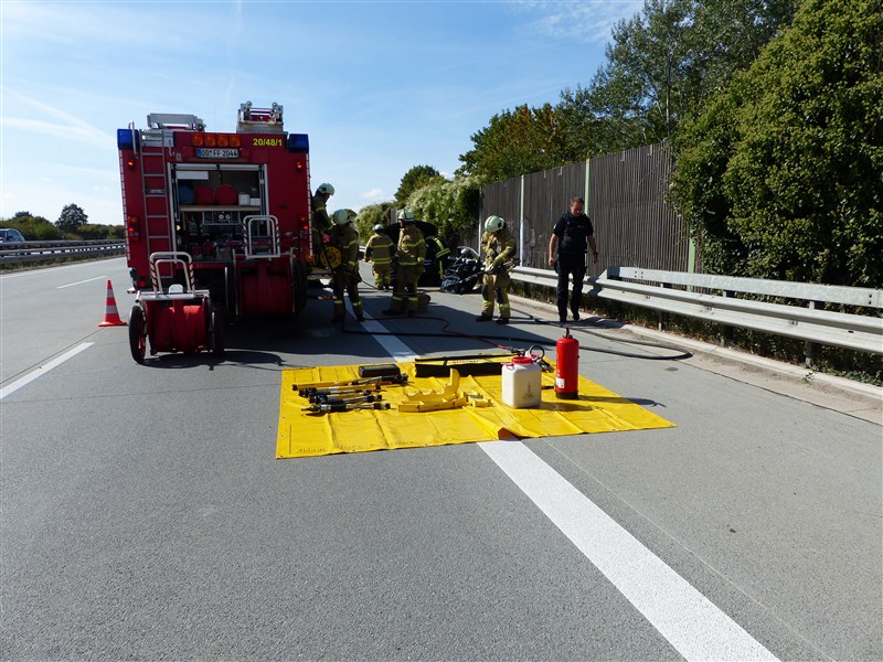 Auf der Autobahn 1 ereignete sich ein Verkehrsunfall mit einem PKW. Vor Ort mussten drei PKW-Insassen mittels hydraulischen Rettungsgerät aus ihrem Fahrzeug befreit werden, weil sich die Fahrzeugtüren nicht mehr öffnen ließen. Zwei der eingeschlossenen Insassen wurden bei dem Unfall leicht verletzt und durch uns erstversorgt. Weiterhin wurden Betriebsstoffe abgestreut und die Fahrzeuge spannungsfrei geschaltet.