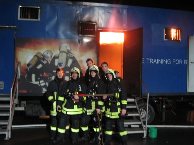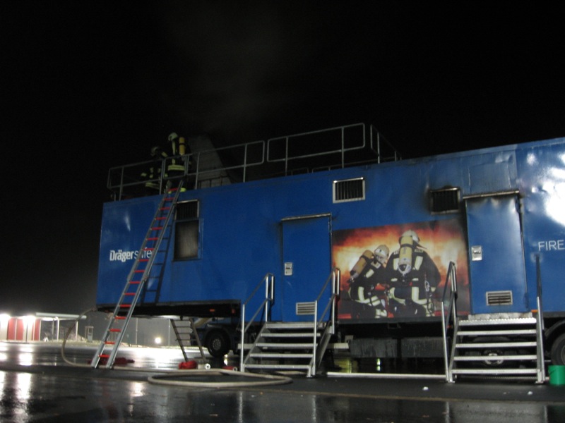 Den Zugang verschaffte sich der Trupp über eine enge, steile "Kellertreppe". Nachdem die Tür geöffnet war, hieß es zügig den brennenden Schreibtisch in der Ecke zu löschen. Als der Trupp weiter ins Innere vorstoßen wollte, fing plötzlich die Treppe an zu brennen. In Windeseile mussten die beiden reagieren, schließlich war das ihr Rückzugsweg. Sobald der Trupp richtig löschte, drehte der Ausbilder im Leitstand langsam das Gas ab und die Flamme wurde immer und immer kleiner. Weiter hinten erwartete den Trupp ein brennendes Bett. Gerade auf halbem durch den Raum, gab es eine Durchzündung - einen sogenannten Flash-over. Durch die vorangegangene Ausbildung wussten beide, was zu tun war: Der Truppmann riss reflexartig das Strahlrohr auf und beide warfen sich nach hinten, um sich zu schützen. Temperaturen um 800°C warten in solchen Fällen unter der Decke auf die Einsatzkräfte.
