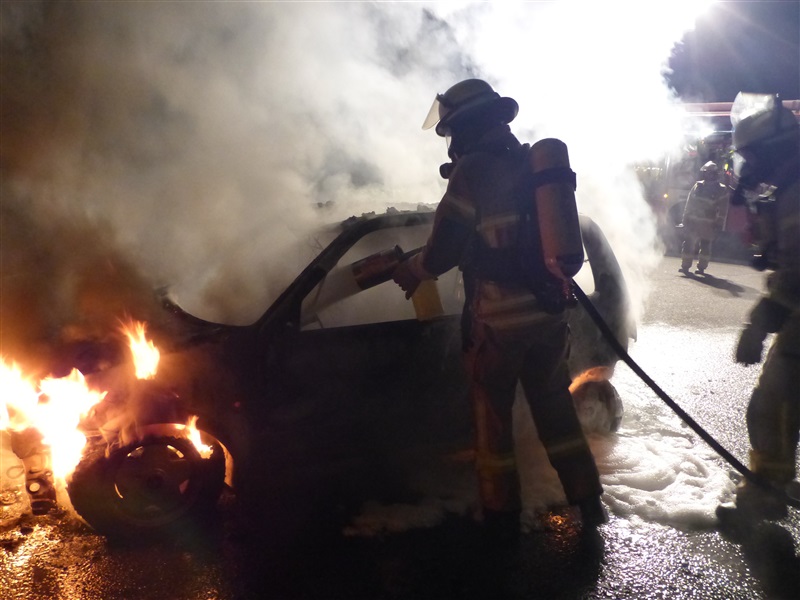 Kurz vor dem Tageswechsel wurden wir von der Leitstelle Süd zu einer unklaren, starken Rauchentwicklung auf einem Parkplatz am Schuhwiesenweg alarmiert. Am Einsatzort fanden wir einen PKW vor, welcher in voller Ausdehnung brannte. Unter Atemschutz und mit dem S-Rohr, sowie Mehrbereichsschaum, wurde das Feuer bekämpft und im Anschluss mit der Wärmebildkamera kontrolliert.
