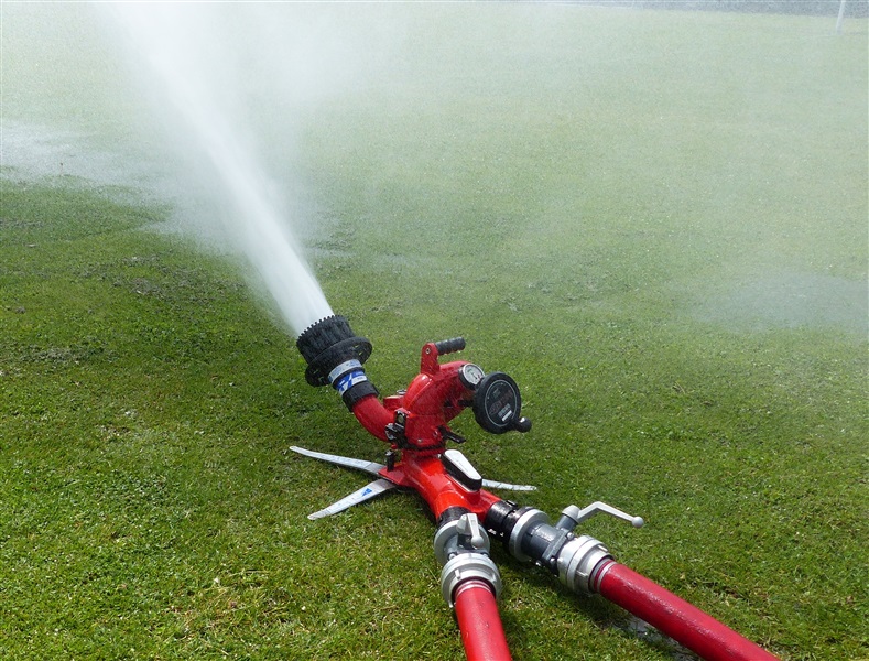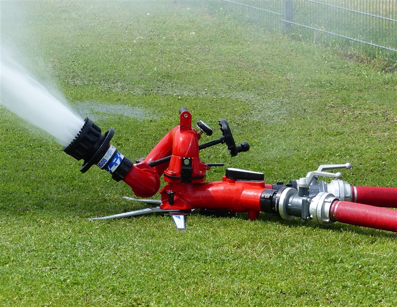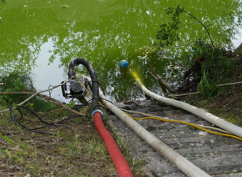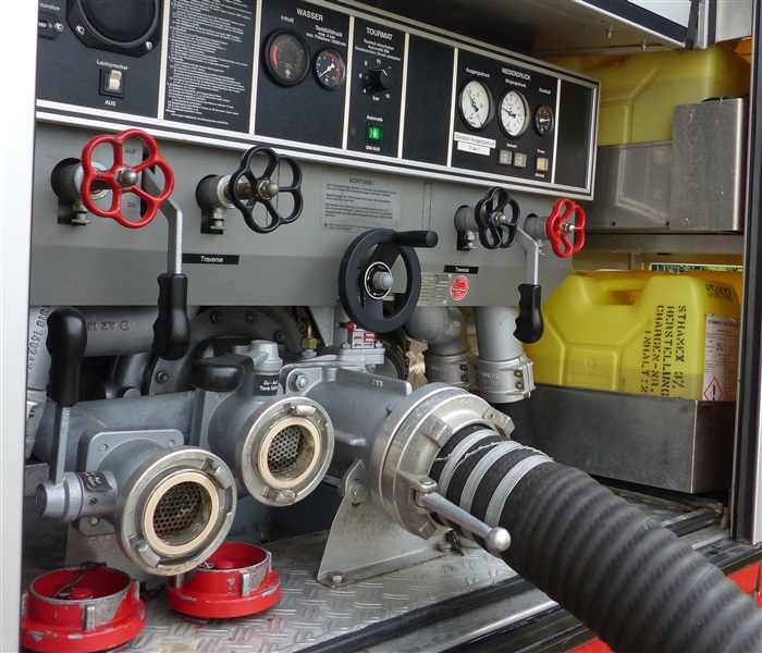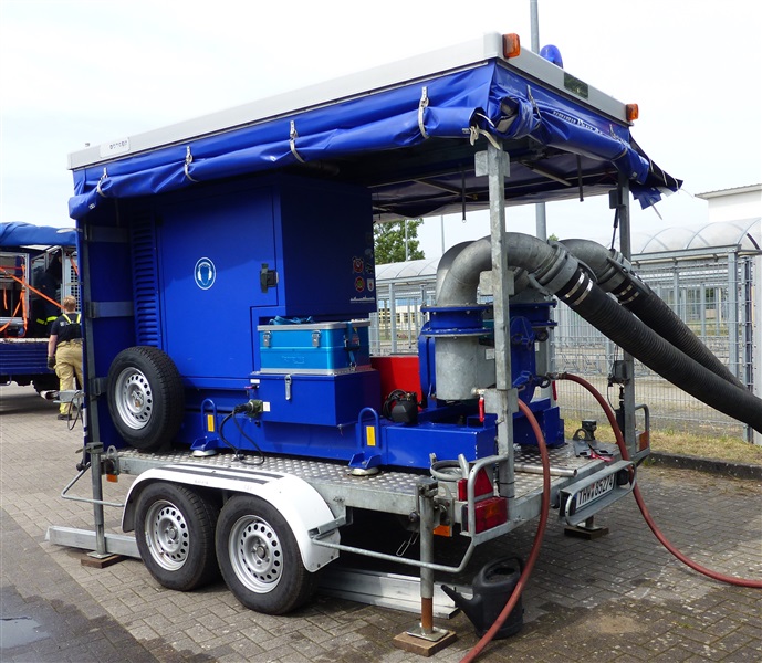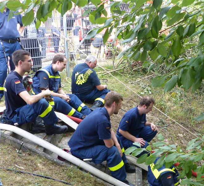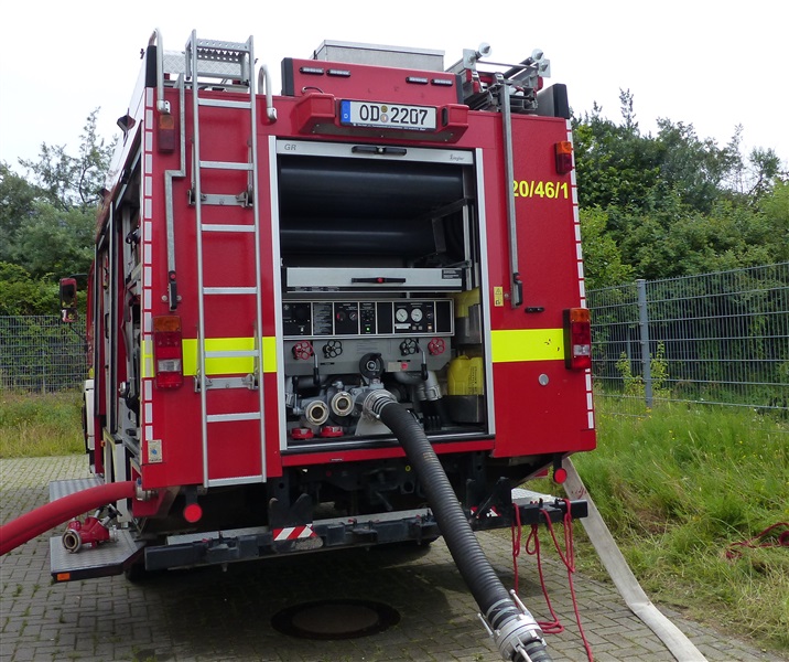 Wir nutzten diese Gelegenheit zum einen für die Ausbildung an unserer eigenen Pumpe des Löschfahrzeugs, sowie um die Möglichkeiten und technische Ausstattung des THW in Sachen Pumpen kennenzulernen. Das THW brachte mehrere Schmutzwasserpumpen mit einer Leistung von jeweils 2000 Liter/Minute, sowie eine Hochleistungspumpe vom Typ „Hannibal“ mit einer maximalen Förderleistung von 15.000 Liter/Minute in Stellung. Hierzu wurden mehrere Schlauchleitung vom Typ „B“ (75mm Durchmesser), „A“ (110mm Durchmesser) und sogar „F“ (160mm Durchmesser) verlegt, um das Wasser aus dem Becken in die Oberflächenentwässerung zu befördern. Ebenfalls kam unser mobiler Wasserwerfer zum Einsatz, mit welchen wir ein Teil des Wassers auf den Sportplatz ausbrachten.