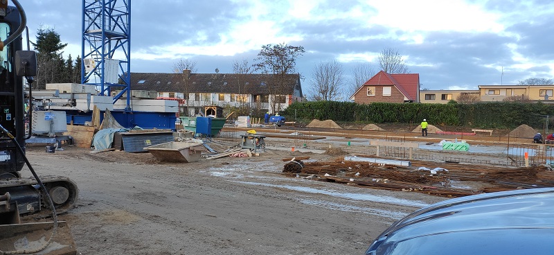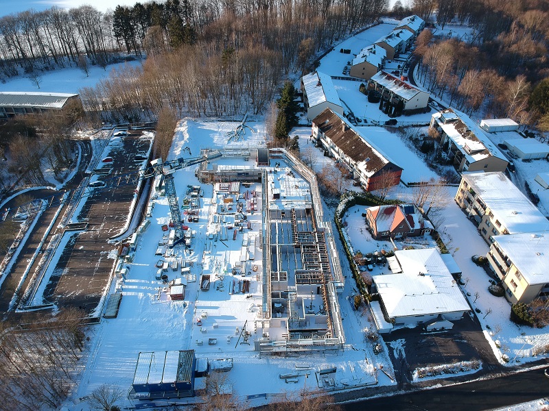 Und trotz des eisigen Winterwetters in diesem Februar, wurde das Erdgeschoss in den letzten Tagen von oben geschlossen durch eine Decke aus Betonfertigteilen geschlossen, sodass sich erstmalig ein „Raumgefühl“ beim Betreten der Baustelle einstellt. Nun dauert es nicht mehr lange, bis auch die Dimensionen des Obergeschosses deutlich werden und der Hochbau der Fahrzeughallen beginnt.