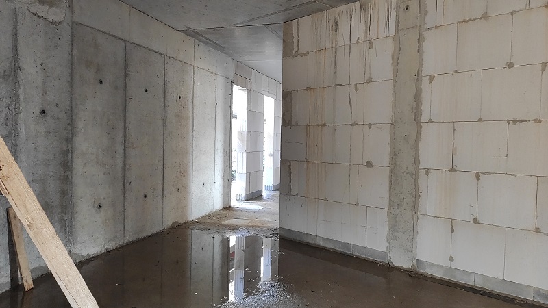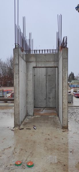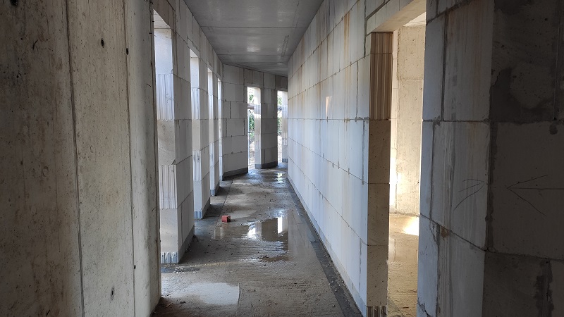 Nach einer kurzen Trocknungsfrist wurden anschließend die ersten äußeren Mauerwerke aus Beton gegossen und parallel mit den Mauerarbeiten aus Porenbetonsteinen für die Innenwände begonnen. Mittlerweile lassen sich sogar Treppenfertigteile und der Aufzugschacht aus der Ferne gut erkennen.