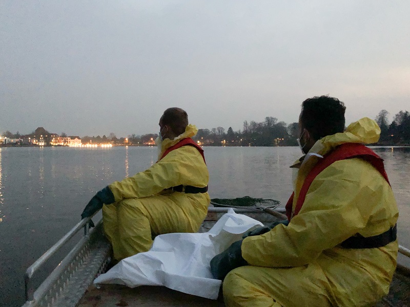 Aufmerksame Passanten meldeten auf dem oberen Herrenteich zwei tote Schwäne, welche auf dem Gewässer trieben. Wir übernahmen deren Bergung mittels Boot und übergaben die Kadaver der Polizei. Anschließend wurde durch eine Tierärztin eine Sichtung der Wildvögel vorgenommen.