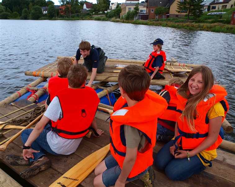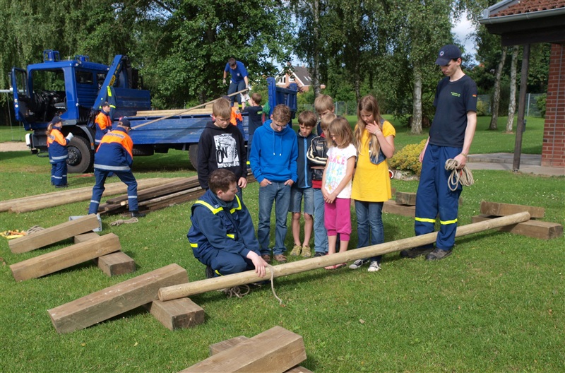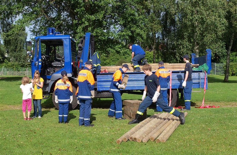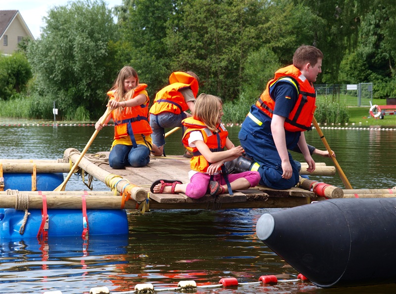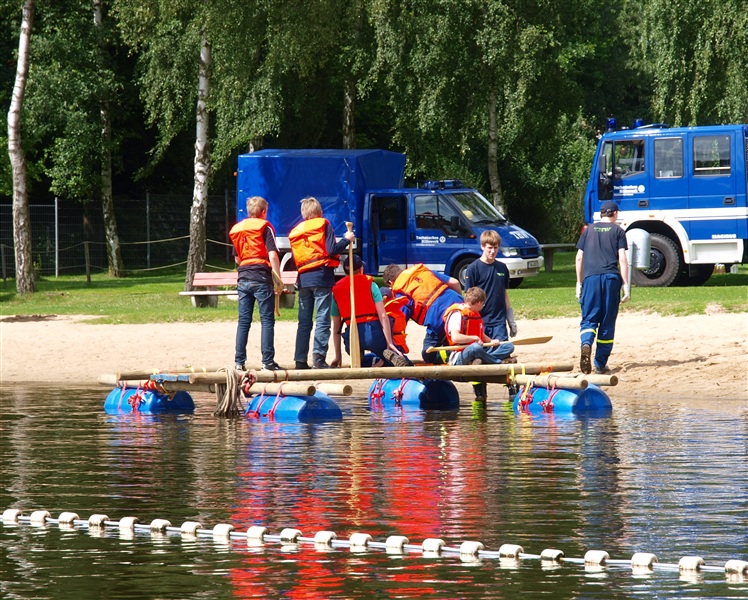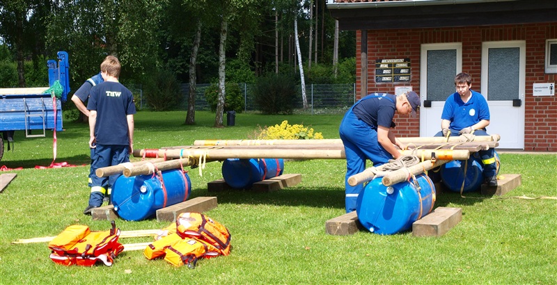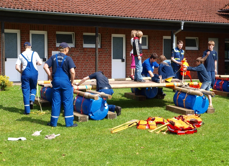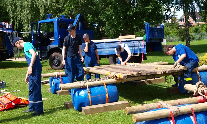 Die Jugendfeuerwehr Reinfeld unterstützte das THW beim Floßbau, welches als eine Aktion im Rahmen des Ferienpasses stattgefunden hat.