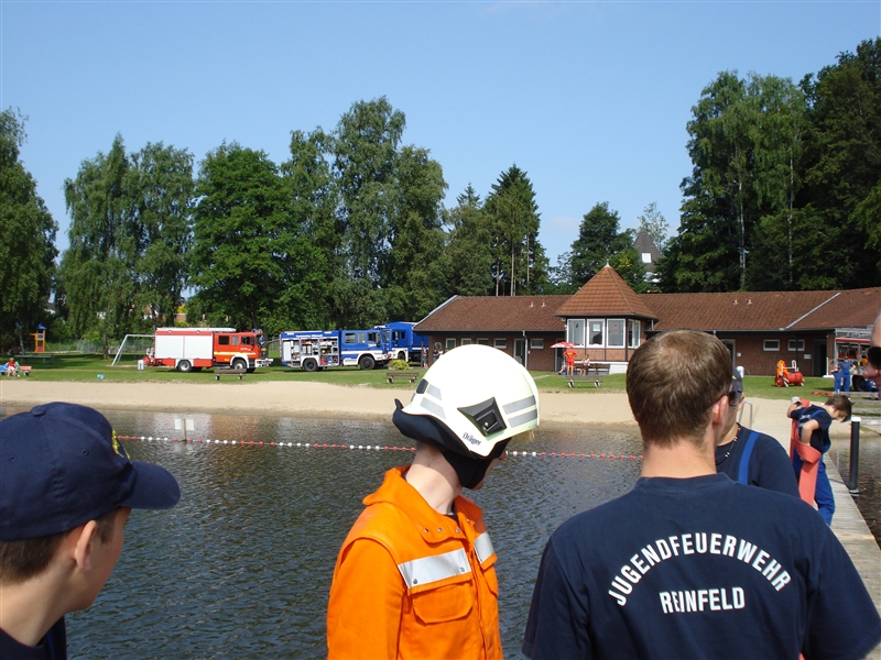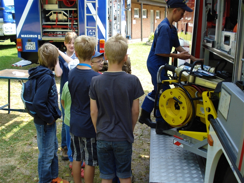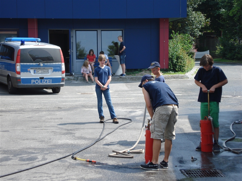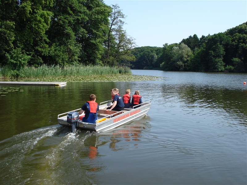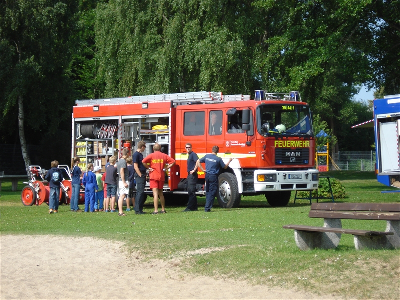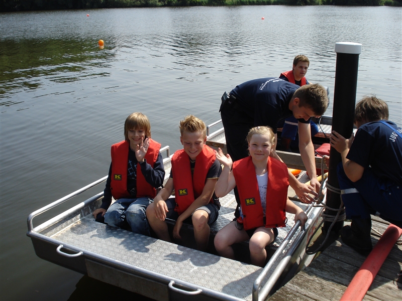 Zusammen mit dem THW Bad Oldesloe führten wir eine Ferienpassaktion in der Badeanstalt am Herrenteich durch. An verschiedenen Stationen konnten die Kinder unter anderem mit Hebekissen einen LKW anheben und erleben, wie es sich anfühlt, ein Strahlrohr in den Händen zu halten. Dabei sind zwar nicht alle trocken geblieben, aber das war bei dem guten Wetter auch gar kein Problem. Zudem konnten die "Kleinen" ihr Geschick mit dem Spreizer beweisen, als es darum ging, Tischtennisbälle unversehrt zu greifen und wieder abzulegen. Nebenbei führten wir sie um eines unserer Fahrzeuge und erklärten die vielen Gerätschaften und ihre Einsatzmöglichkeiten. Zu guter Letzt durfte jeder eine Runde mit unserem Boot auf dem Herrenteich drehen. Zurück an der Wache grillten wir gemeinsam und kühlten uns mit Wasserspielen ein wenig ab.