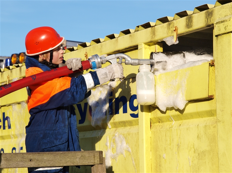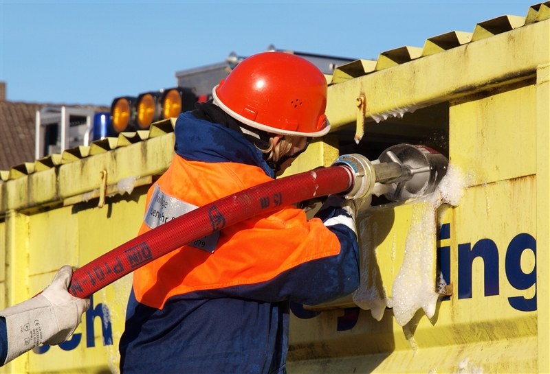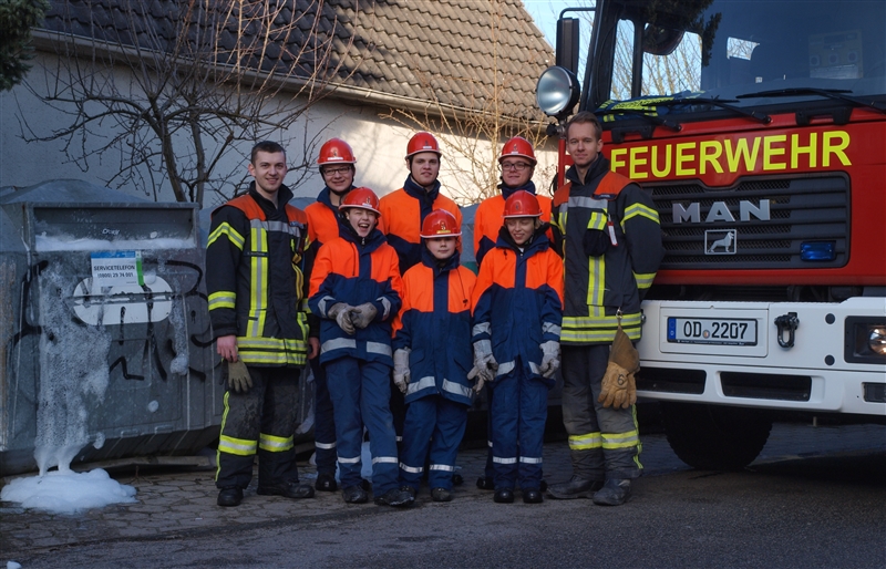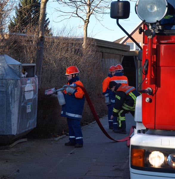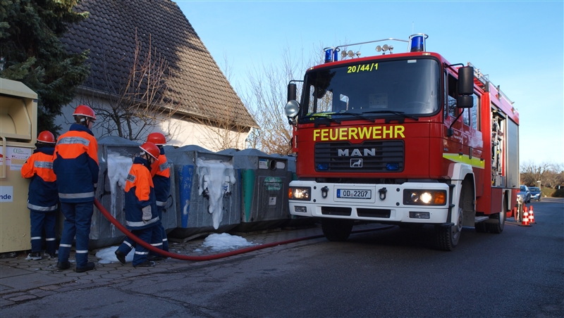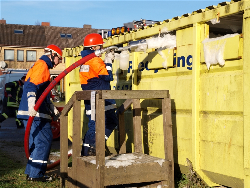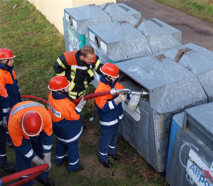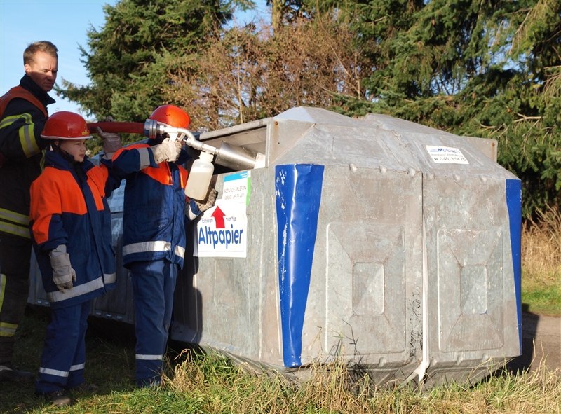 Damit die Einsatzabteilung in der Silvesternacht nicht wegen eines brennenden Papiercontainers ausrücken muss, schäumte die Jugendfeuerwehr vorsorglich alle Papiercontainer in Reinfeld und näherer Umgebung ein. Nachdem die Arbeit getan war, gab es für jeden noch einen Berliner zur Stärkung.
