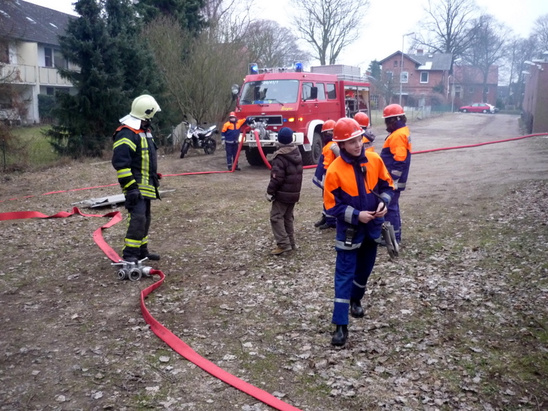 Für die Übung am letzen Freitag hatten sich die Betreuer etwas besonderes für die Jugendlichen der 2. Gruppe ausgedacht: Sie sollten einen Einsatz abarbeiten, bei dem zwei Personen in einer brennenden Werkstatt vermisst wurden. Die Jungen und Mädchen gingen mit den selbstgebauten "Atemschutzgeräten" und einem Strahlrohr vor. Der Rest kümmerte sich um die Wasserversorgung und um die Verletzten. Mit viel Spaß und Freude arbeiteten die Jugendlichen den Rest des Einsatzes ab.